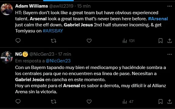 Bastou a entrada de G. Jesus para tudo ser possível. O gol de empate do Arsenal é muito por influência do atacando formado nas categorias de base do Verdão. O resultado da partida contra o Bayern agora é de 2 a 2.