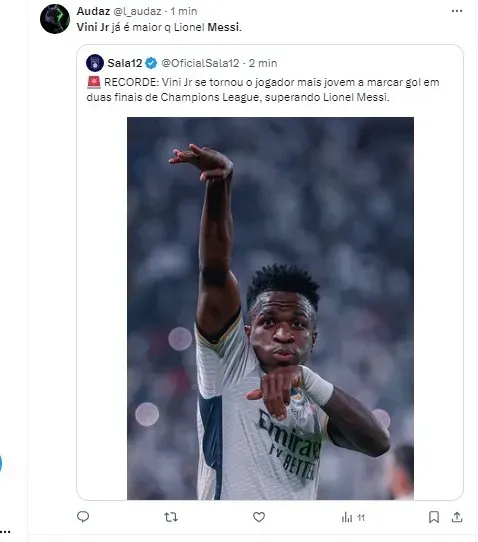 “Com 23 anos e 325 dias, Vinícius Júnior se tornou o jogador mais jovem a marcar gol em duas finais de UEFA Champions League, superando o recorde de Lionel Messi (23a 338d em 2011)”, informou o perfil de estatísticas.
