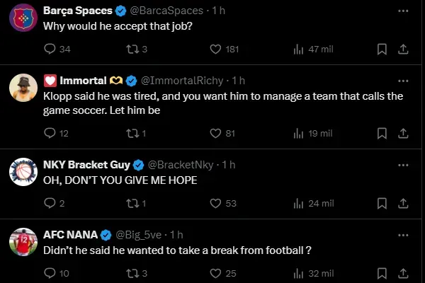 “Agora estamos focados em trabalhar com nosso diretor esportivo Matt Crocker e alavancar sua experiência nos níveis mais altos do esporte para garantir que encontremos a pessoa certa”, acrescentou sem citar Jürgen Klopp.