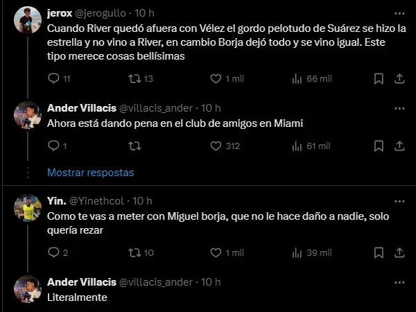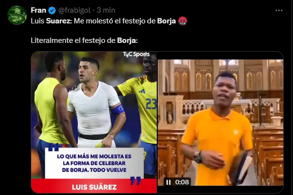 Jogador do River Plate após passagens por Palmeiras e Grêmio, dentre outros times, Miguel Borja comemorou ao nível de incomodar o craque Luís Suárez. O camisa 9 respondeu ao colombiano na zona mista.