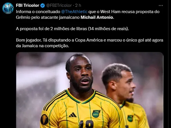 O Grêmio fez oferta ao centroavante Michail Antonio. A informação é do jornal The Athletic, especializado em mercado da bola através do New York Times. O West Ham, clube do jogador, respondeu.