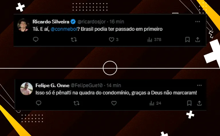 Por outro lado, a CONMEBOL reconheceu o erro da equipe de arbitragem em não marcar o pênalti para o Brasil. Segundo a entidade, o VAR julgou que o colombiano tocou na bola antes de derrubar Vinícius Júnior.