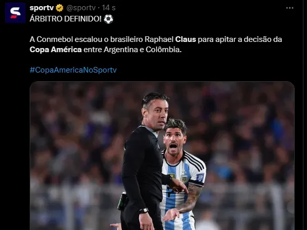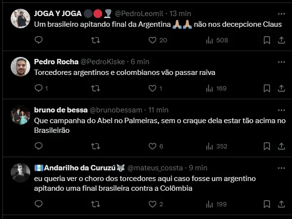 “Eu queria ver o choro dos torcedores aqui caso fosse um argentino apitando uma final brasileira contra a Colômbia”, comentou um internauta sobre a escolha do árbitro para a decisão.