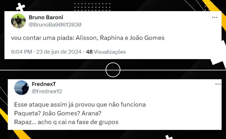 Assim, a Seleção Brasileira vai entrar em campo com: Alisson; Danilo, Militão, Marquinhos e Guilherme Arana; João Gomes, Bruno Guimarães e Lucas Paquetá; Raphinha, Vinicius Jr e Rodrygo.