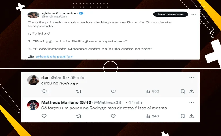 Já na segunda posição, Ney citou dois nomes empatados. Na opinião do astro, Rodrygo e Jude Bellingham, também do Real Madrid, tiveram desempenho para tal posição.