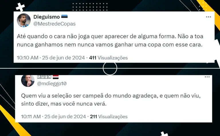 Primeiro, o camisa 10 respondeu um comentário de um torcedor que alegava que Ronaldinho estava certo em posicionar contra o futebol da Seleção. O jogador, em um tom forte, disse: “Cala boca”. Ainda na web, ele usou seu Instagram para desabafar e refletir sobre a pressão que enfrenta os jogadores profissionais.