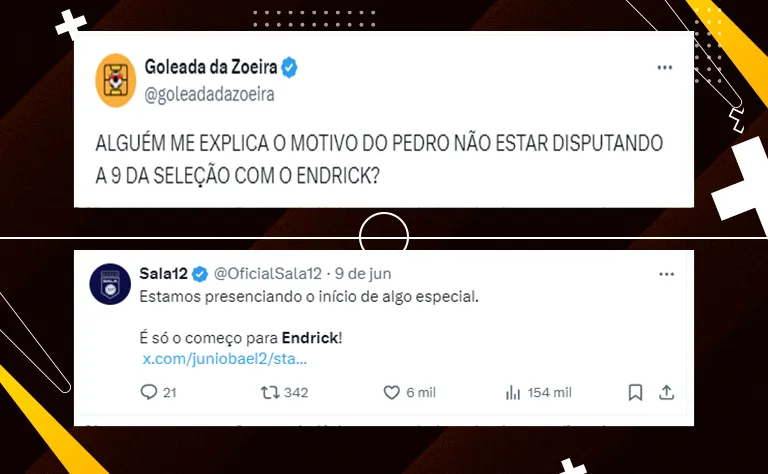 Endrick, que está com 17 anos de idade, soma sete jogos pelo time principal da Seleção Brasileira, tendo três gols marcados. Em 2024, pelo Palmeiras, somou quatro gols em 22 partidas.
