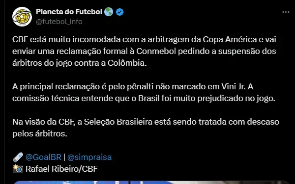“A comissão técnica entende que o Brasil foi muito prejudicado. Na visão da CBF, a Seleção Brasileira está sendo tratada com descaso pelos árbitros”, destaca a jornalista.