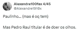 Mas a torcida chamou a atenção para a provável escalação da equipe que pode ter o atacante Pedro Raul como titular. Muitos não aprovaram essa possibilidade.