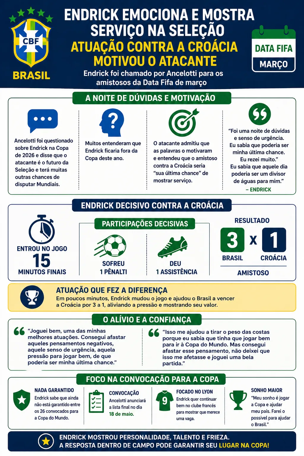 Muitos entenderam que Ancelotti deixaria Endrick fora da Copa deste ano. O jogador também admite que as palavras o motivaram, pois entendia que o amistoso contra a Croácia seria sua “última chance” de mostrar serviço ao italiano.