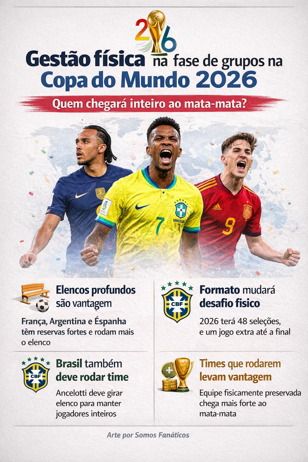 A gestão física das seleções que disputarão a Copa do Mundo de 2026 será determinante para o sucesso no mata-mata. Determinadas equipes, como França, Argentina e Espanha, estão entre os três times que mais possuem margem para administrar o condicionamento físico.