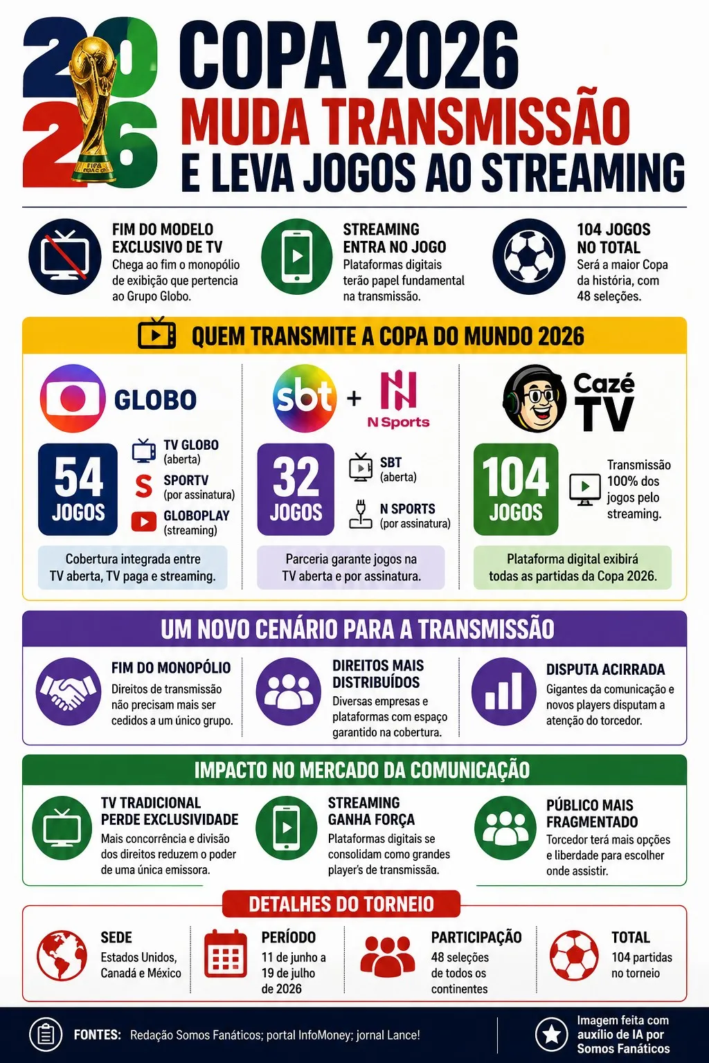 A Copa do Mundo de 2026, que pela primeira vez terá a participação de 48 seleções, e com isso 104 partidas, também rompe com aquele padrão tradicional de TV aberta e por assinatura e a transmissão por streaming entra no jogo.