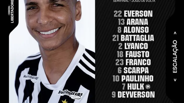 Atlético Mineiro: Everson; Lyanco, Battaglia e Alonso; Scarpa, Alan Franco, Fausto Vera, Arana; Deyverson, Hulk e Paulinho.