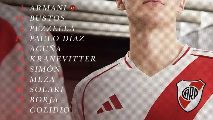 River Plate: Armani; Bustos; Pezzella, Paulo Díaz e Acuña; Simón, Kranevitter, Solari e Meza, Colidio e Borja.