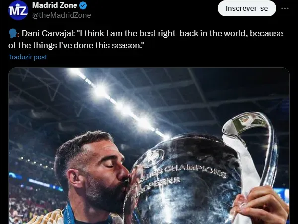 “Acho que sou o melhor lateral-direito do mundo, pelas coisas que fiz nesta temporada”, disse o medalhão conforme publicado pelo perfil Madrid Zone (@TheMadridZone), no Twitter.