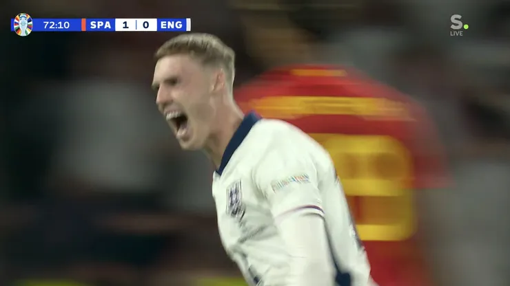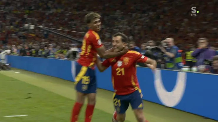 Dani Olmo roubou a bola e lançou Lamine Yamal. O jovem espanhol driblou e invadiu a área, mas foi travado no chute por Guehi antes dela ir para meta.