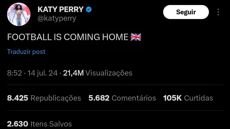 "Football is coming home", disse a cantora através de seu perfil oficial no X.