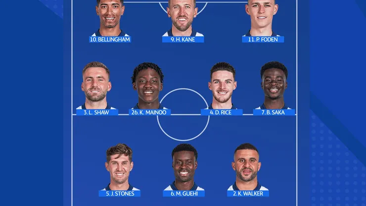 Pickford, John Stones, Marc Guehi e Kyle Walker; Luke Shaw, Koby Mainoo, Declan Rice e Bukayo Saka; Jude Bellingham, Harry Kane e Phil Foden.