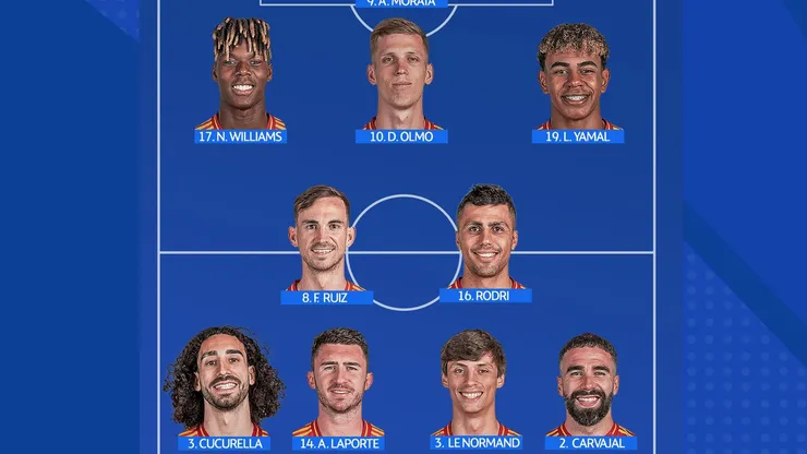 Unai Simon, Marc Cucurella, Dani Carvajal, Laporte e Le Normand; Rodri, Fabian Ruiz e Dani Olmo; Yamal, Williams e Morata