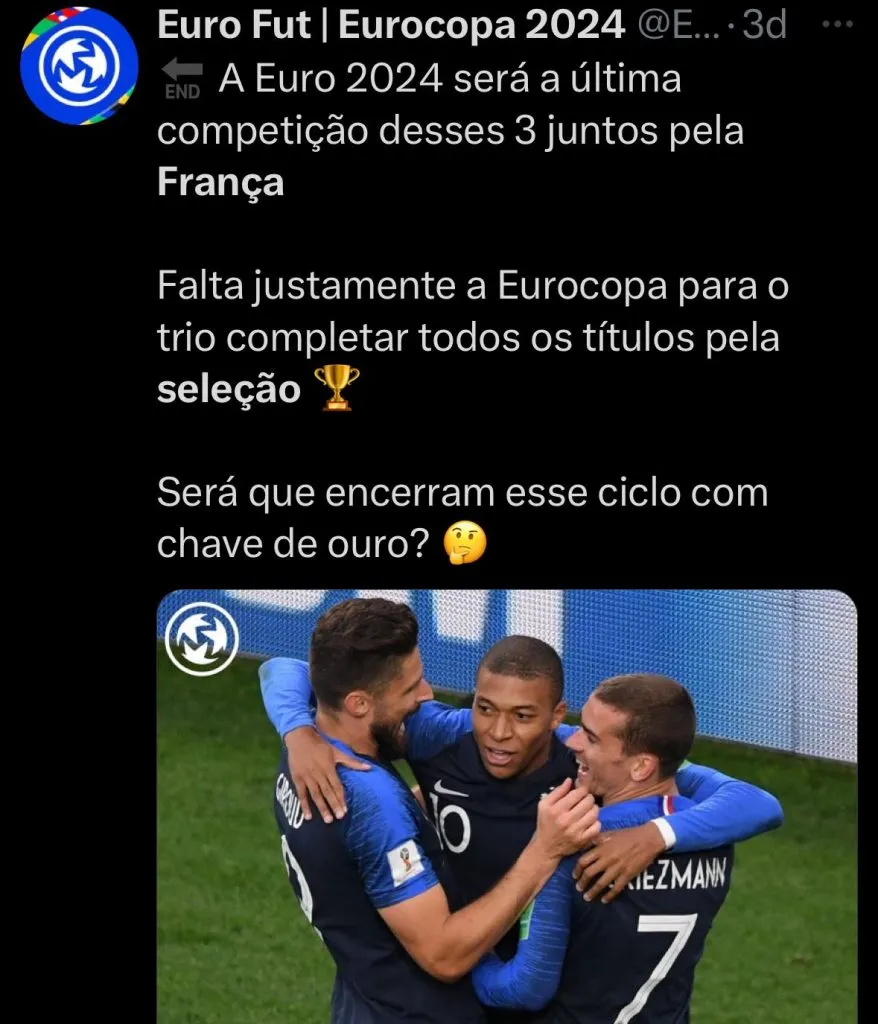 Entre os grandes nomes do jogo está Mbappé, estrela da seleção francesa, que já foi anunciado oficialmente pelo Real Madrid. O atacante busca o título da Euro para encerrar a temporada com chave de ouro.