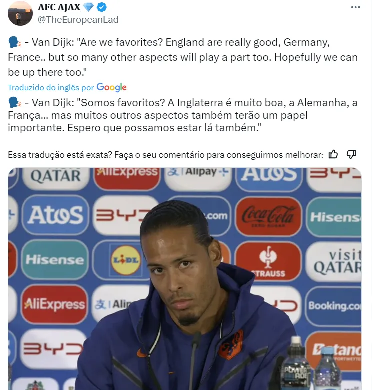 “Somos favoritos? A Inglaterra é muito boa, a Alemanha, a França… mas muitos outros aspectos também terão um papel importante. Espero que possamos estar lá também”, disse Van Dijk.