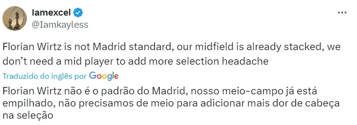 “No Real Madrid ou no Bayern de Munique? Essa é uma pergunta difícil. Jamal já está jogando pelo Bayern, e eu me sinto feliz no Leverkusen”, completa Wirtz, sobre os rumores.