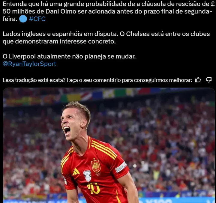 O Liverpool foi mencionado pelo jornalista Ryan Taylor, do Daily Mirror, mas é muito improvável que os Reds entrem em disputa com o Chelsea, já que Olmo não é a prioridade em Anfield Road.