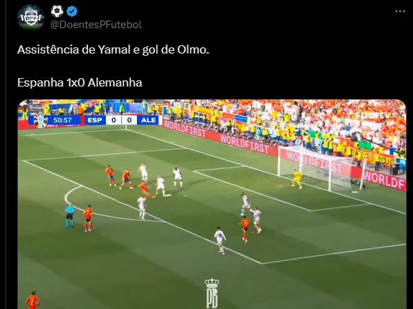 Com assistência de Lamine Yamal e gol de Dani OImo, a Espanha começou vencendo a Alemanha por 1 a 0 na Eurocopa 2024. O placar abriu aos 6 minutos do segundo tempo até o empate no último minuto, com gol de Wirtz.