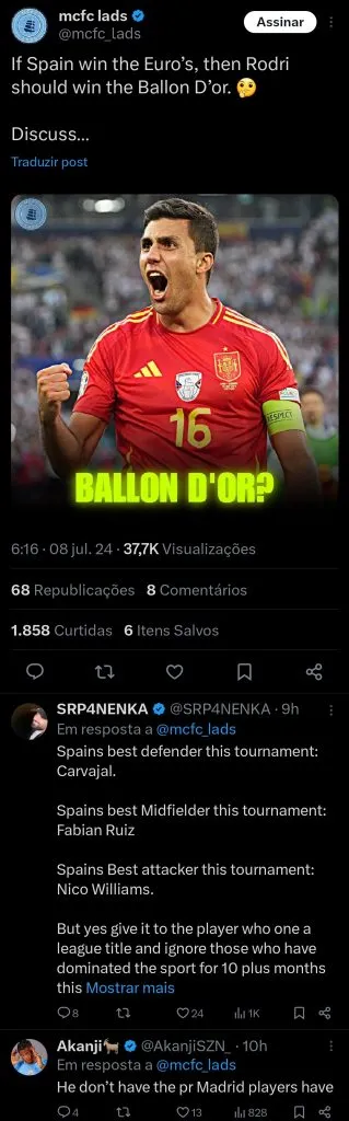 “Mbappé. Mas a França é mais que Mbappé. Eles são fortes na defesa, não gostaria de individualizá-los”, completou Rodri quando questionado em relação ao camisa 10 da França.