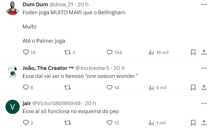 Nas redes socias, torcedores estão divididos em relação a polêmica declaração de Rooney. Alguns são a favor, enquanto outros acreditam que Bellingham está acima de Foden pela temporada.