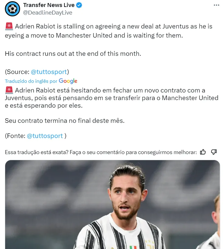 Defendendo as cores da Juventus desde a temporada de 2019, Rabiot está em fim de contrato e, de acordo com informações do jornal Tuttosport, está à espera de uma oferta do Manchester United.