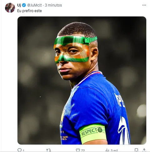 A Federação Francesa de Futebol (FFF) comunicou que uma máscara de proteção foi pedida como parte da recuperação de Mbappé. Segundo a imprensa francesa, ela deve chegar nesta quinta-feira (20). Na chegada a Leipzig mais cedo, o jogador desembarcou com o nariz sem qualquer proteção (imagem acima).