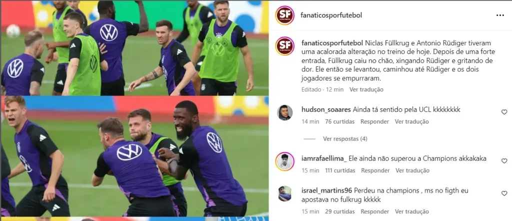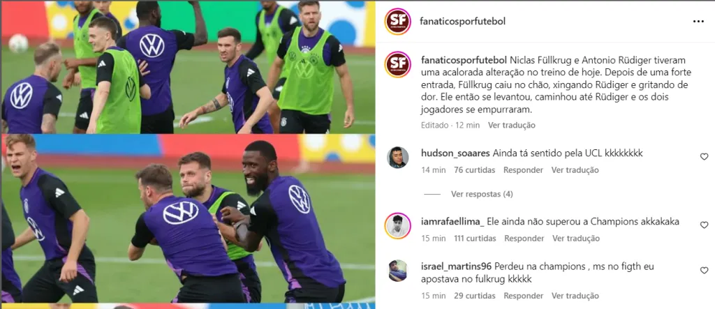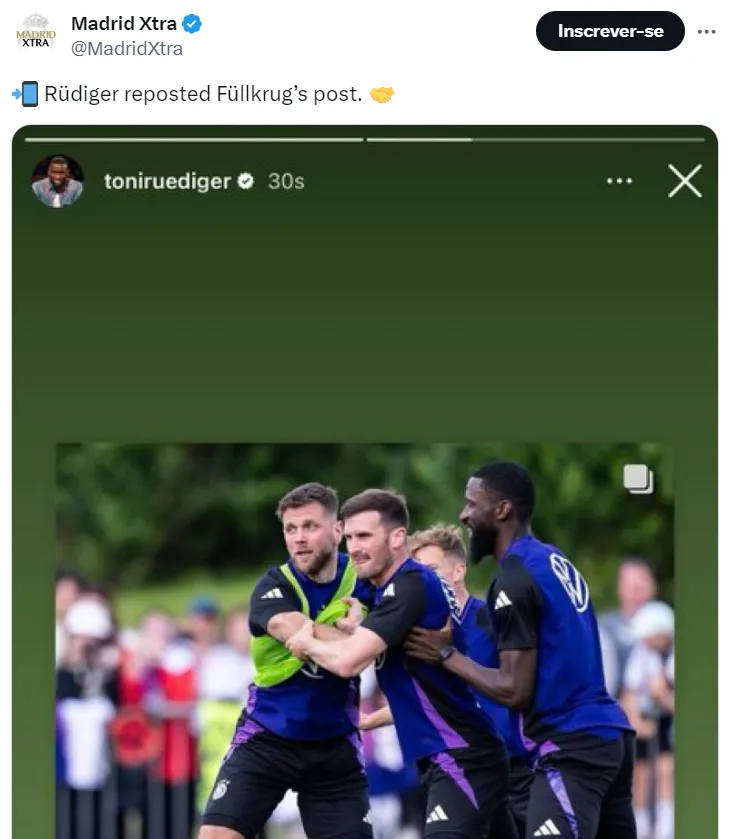 Nas redes sociais, Rudiger já se manifestou diante da repercussão negativa da confusão que se tomou na imprensa alemã, postando uma foto ao lado de Füllkrug, dando ao entender que a paz já foi estabelecida.