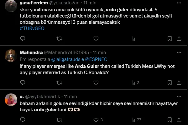 A Turquia venceu a Geórgia pelo placar de 3 a 1, na primeira rodada do Grupo F da Eurocopa 2024. Com gols de Melt Muldür, Arda Güller e Muhammed Kerem, a seleção conseguiu a liderança temporária.