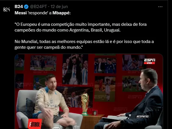 Às vésperas do começo de mais uma edição da Euro, Mbappé deu declaração que repercute no meio do futebol: para o craque da França, é mais difícil ser campeão da competição europeia do que da Copa do Mundo. O argentino Messi, campeão mundial em cima dos franceses, saiu em defesa do nível de dificuldade da competição organizada pela Fifa.