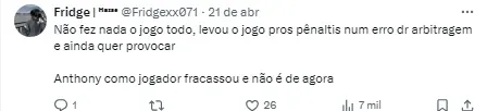“O jeito que nossos torcedores foram tratados pelo atleta deles não foi legal. E eu, no calor do momento, reagi às provocações em uma defesa natural ao meu clube”, disse Antony.