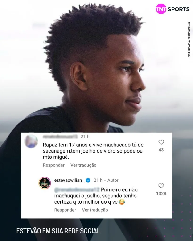 “Rapaz, tem 17 anos e vive machucado. Está de sacanagem. Tem joelho de vidro, só pode. É muito migué”, escreveu um internauta nesta quinta-feira (3) sobre Estêvão estar lesionado.