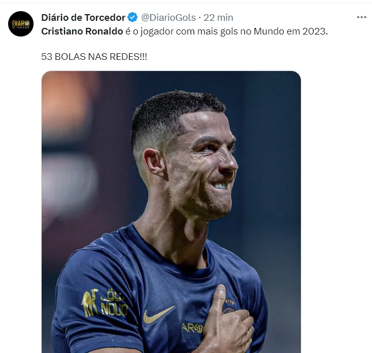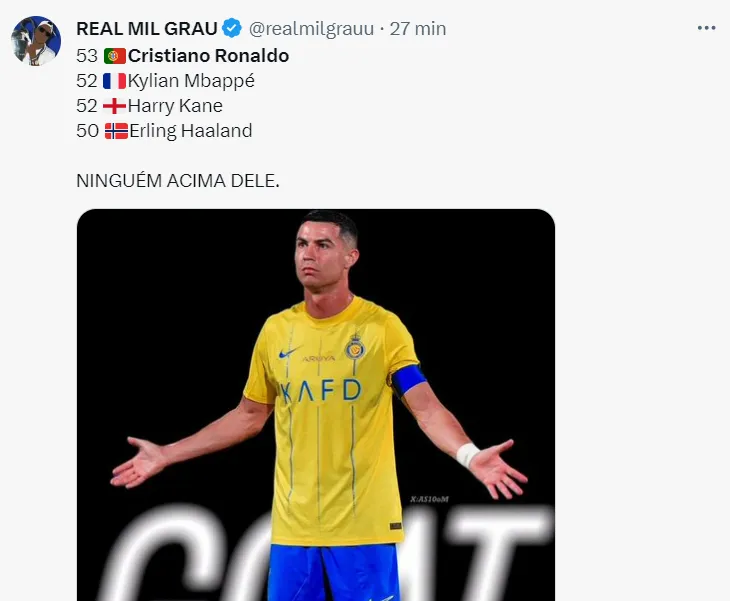 Cristiano Ronaldo se tornou o maior artilheiro do mundo em 2023, superando Mbappé, do PSG, e Kane, do Bayern. Ele também supera o Haaland, do Manchester City, com 50.