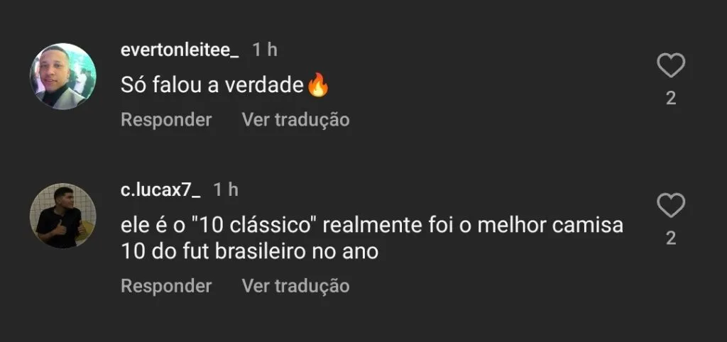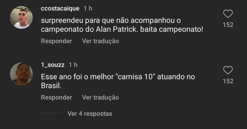 “O que eu mais gostei no Campeonato Brasileiro foi o menino do Internacional (Alan Patrick).”, disse Alex durante a entrevista.