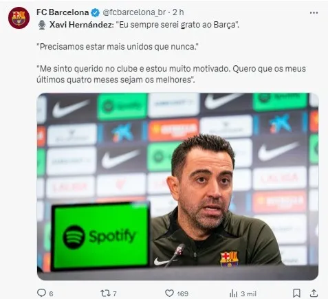 “Nestes momentos, que não são fáceis, precisamos de união. Foi o que pedi desde o primeiro dia, e agora, mais do que nunca. Torcedores e o vestiário foram incríveis comigo após o anúncio. É um momento de união e de caminhar passo a passo. A temporada não acabou. Queremos competir e terminar da melhor maneira possível”, afirmou Xavi em uma conversa com a imprensa espanhola.