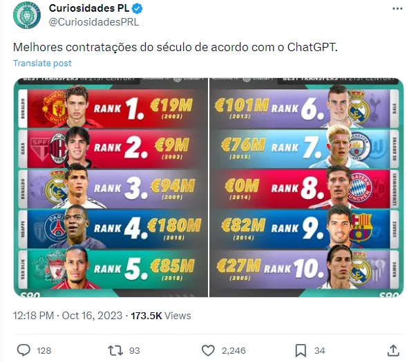 O top 10 formado pela inteligência artificial é, sem dúvida, uma bela seleção. No entanto, alguns nomes de peso não aparecem, como é o caso de Neymar, que saiu do Santos para o Barcelona, tornando-se um dos maiores brasileiros na história do clube catalão.