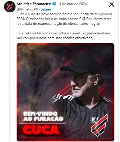 A decisão veio após a demissão de Juan Carlos Osorio, que ocorreu após a derrota para o Londrina nas quartas de final do Campeonato Paranaense. Cuca assinou contrato com o Furacão até o final de 2024.