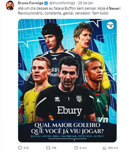 “O Neuer tem duas finais de Champions fantásticas, sendo elenco o melhor jogador da final de 2013. E também faz uma grande Copa do Mundo em 2014. O Neuer é expoente do jogo técnico e tático para goleiro. A questão física dele é boa também, ele tem 37 anos mas parece que tem 25. E o Neuer é o goleiro que tem menos falhas. Se você pesquisar ‘falhas do Manuel Neuer’ você vai ver pouquíssimas. Casillas e Buffon têm algumas”, pontua.