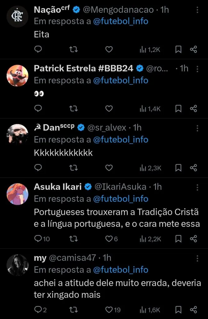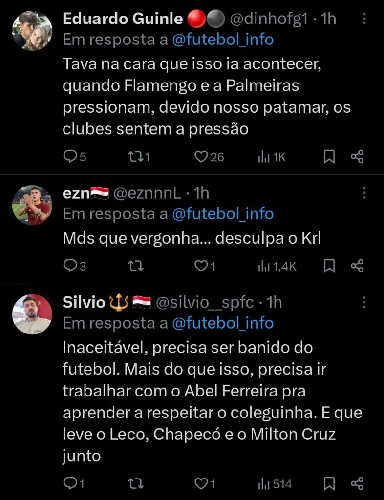 “Ao final da partida entre São Paulo x Palmeiras, no calor do momento acabei proferindo uma frase inadequada. Portanto, peço desculpas ao treinador, o Palmeiras e toda a comunidade portuguesa”, continuou antes de finalizar.