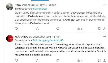 “Eu entendo que o ambiente, o treinador só terá tranquilidade para trabalhar quando um dos dois estiverem em um outro time. Minha visão é que Pedro e Gabigol no Flamengo pesou, passou do tempo de alguém tentar conseguir interagir e fazer os dois funcionarem. O que fica no banco não está gostando, a torcida toma partido e parece ser para o lado do Gabriel”, disse o comentarista.