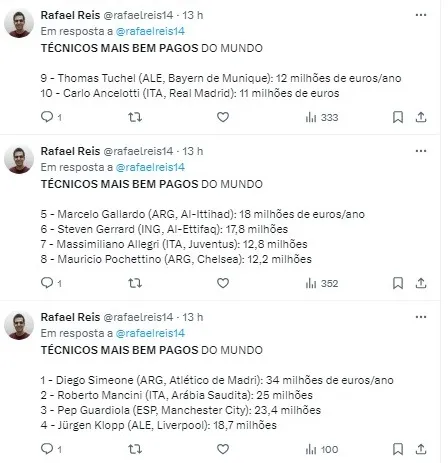 Surpreendentemente, nenhum treinador brasileiro se destacou na lista, enquanto os argentinos demonstraram sua supremacia, com três profissionais entre os mais bem remunerados anualmente.