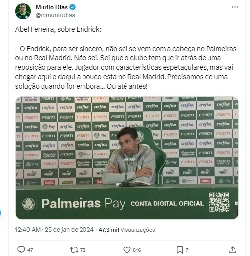 “Para ser muito sincero, não sei com que cabeça ele vem, se no Palmeiras, no Real Madrid, não sei… Sei que o clube tem que ir atrás de uma opção. Endrick é um jogador com características espetaculares, faro para gol, mas que vai chegar e daqui a pouco está no Real”, afirmou Abel Ferreira durante uma coletiva de imprensa.