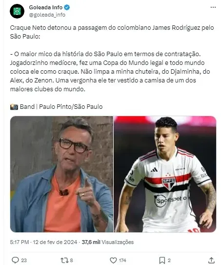 Durante o programa “Donos da Bola”, da TV Bandeirantes, Neto descreveu James como “o maior mico da história” do clube tricolor e sua passagem como “vergonhosa”.
