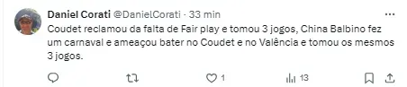 Coudet foi punido com três jogos de suspensão pela expulsão nesta partida, ainda pela sétima rodada do Campeonato Gaúcho. Ele já cumpriu uma partida, mas não deve estar pressente no jogo deste sábado (2), contra o Juventude e pelas quartas de final da competição.