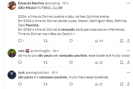 “Pra você, quem vai ser o campeão paulista?”, perguntou Neto para Lívia Nepomuceno. “Pra que essa pergunta agora? Não sei”, respondeu a comentarista. “Pra mim, o São Paulo“, cravou o ex-jogador.